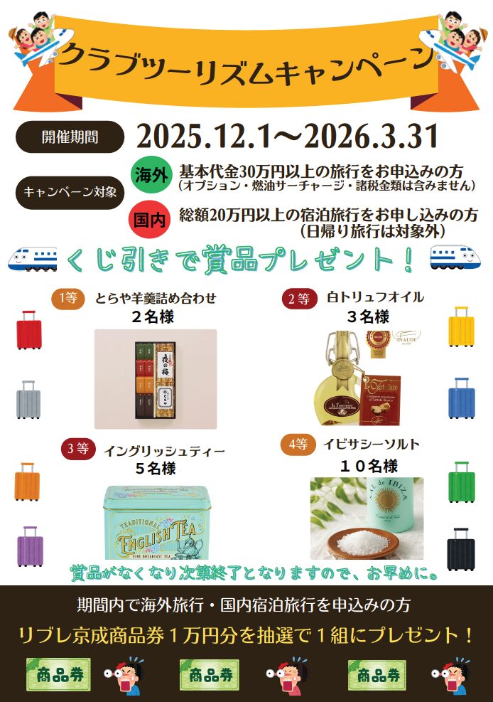 京成トラベル クラブツーリズムキャンペーン2025 クラブツーリズムキャンペーン 2025年12月1日~2026年3月31日に クラブツーリズム商品をお申込みの方に抽選のチャンス! (詳しくは店頭にてご確認ください。)