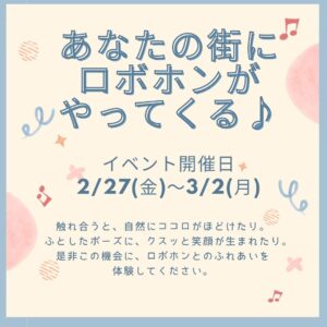 あなたの街にロボホンがやってくる♪ 触れ合うと、自然にココロがほどけたり。 ふとしたポーズに、クスッと笑顔が生まれたり。 いまこの時をともにするパートナーとして、家族として。 家に帰ることや、お出かけがちょっとワクワクします。 是非この機会に、ロボホンとのふれあいを体験してください。 ■ロボホン紹介:https://robohon-event.info/lp/?utm_source=institution_medium&utm_medium=popup_lp&utm_campaign=Announce■ロボホン来店予約HP:https://robohon-event.info/reservation/5230/?utm_source=facility&utm_medium=hp■主催:株式会社ベネフィットジャパン ■ロボホン紹介:https://robohon-event.info/lp/?utm_source=institution_medium&utm_medium=popup_lp&utm_campaign=Announce■ロボホン来店予約HP:https://robohon-event.info/reservation/5230/?utm_source=facility&utm_medium=hp■主催:株式会社ベネフィットジャパン